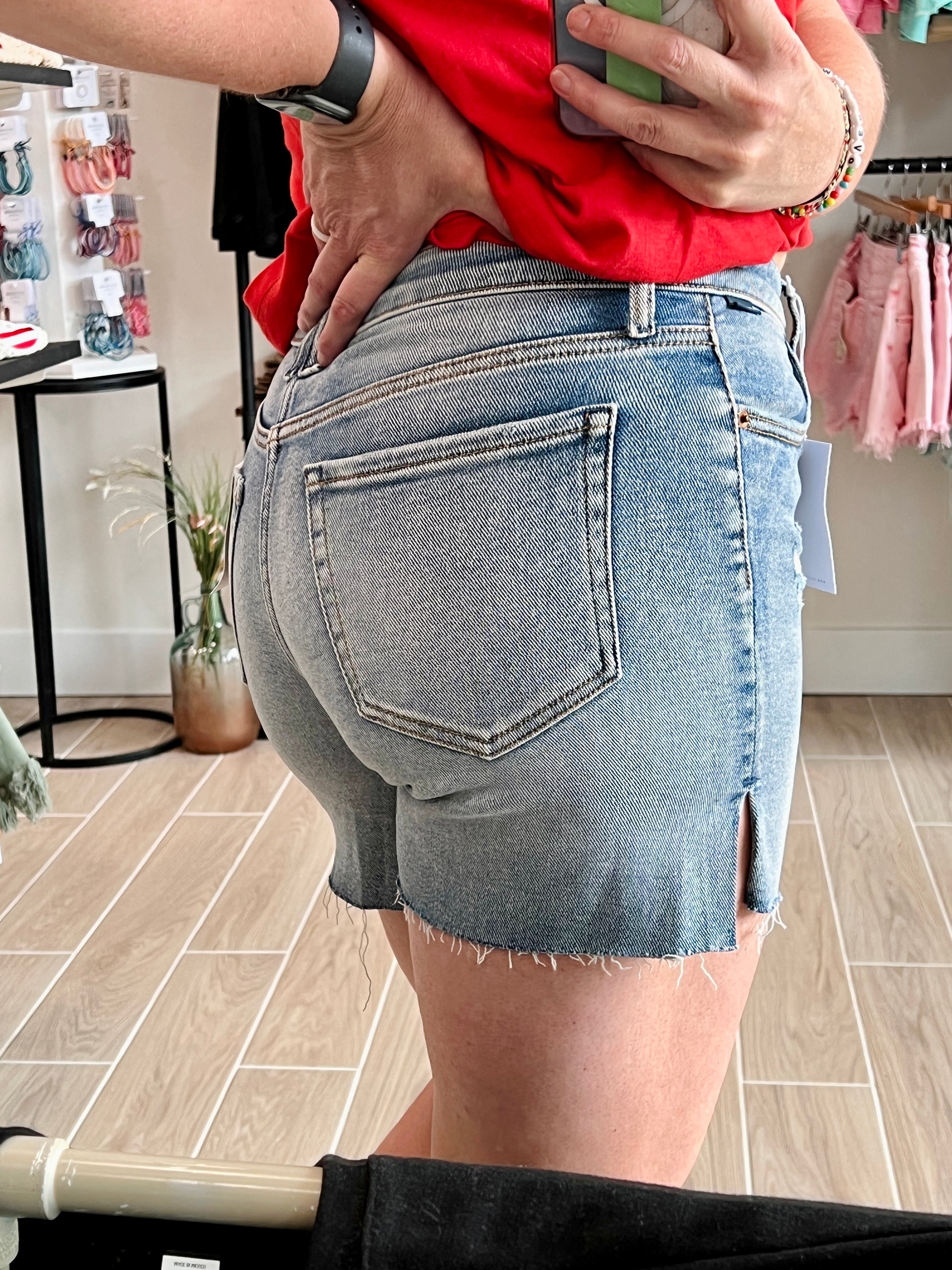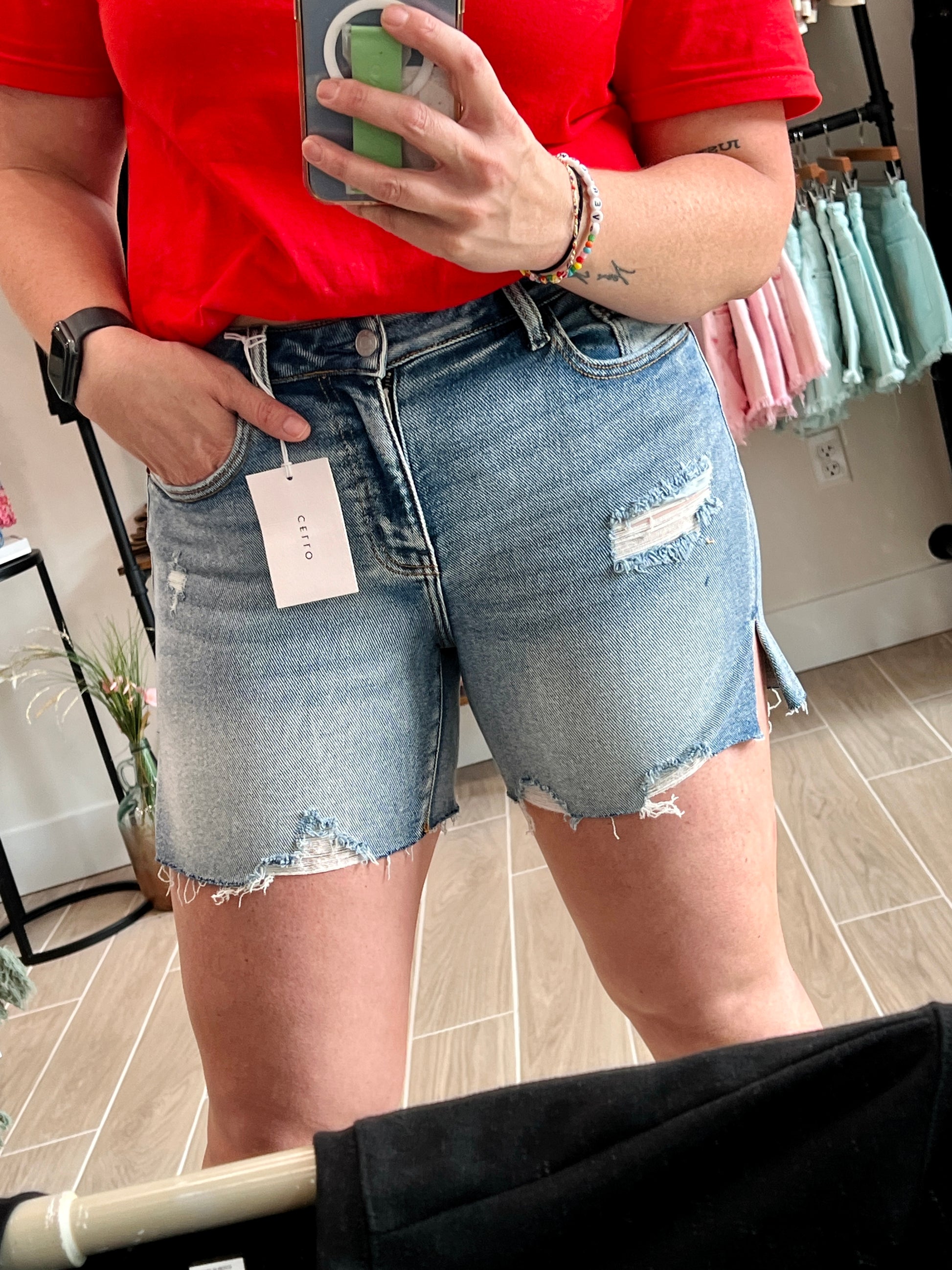 The Cello Mom Short Mid Rise with Side Slit is the perfect jean short for moms. The mid rise and side slit provide both comfort and style, while the longer length and distressed details add a touch of edge. It's the ultimate combination of fashion and practicality.